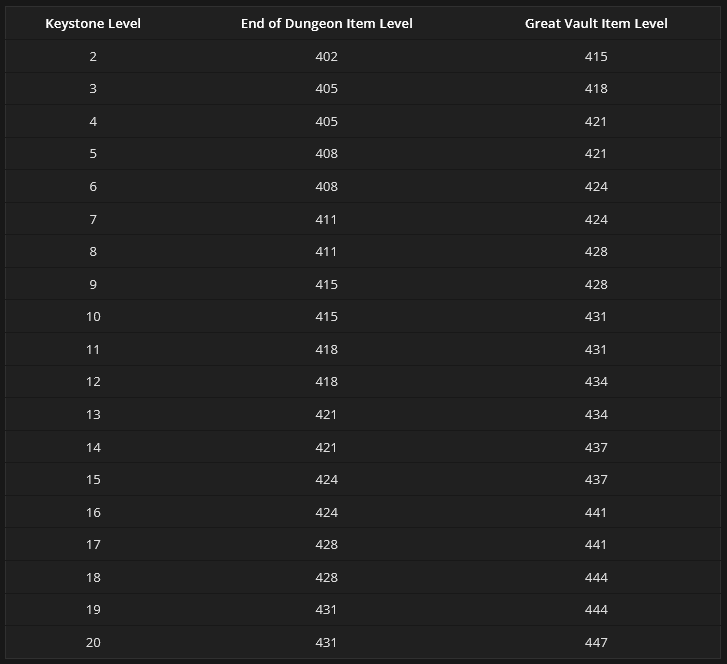 그 외에 신화+ 쐐기 보상 같은 경우는 1회 4회 8회인데 예를 들어 20단 3회 18단 3회 17단 2회를 하였다면 첫 번째 보상엔 447 보상 두 번째 보상엔 18단 보상인 444 보상 세 번째 보상엔 17단 보상인 441 보상이 등장하게 된다. 횟수를 채운 던전 내에서 가장 높은 난도로만 계산을 하게 된다. 다시 말하면 20단 이상 8바퀴를 해야 447 보상 3개가 등장하고 20단 4바퀴 19단 20바퀴를 하였다면 1,2 보상은 447 3번째 보상은 444 보상이 나오게 된다.